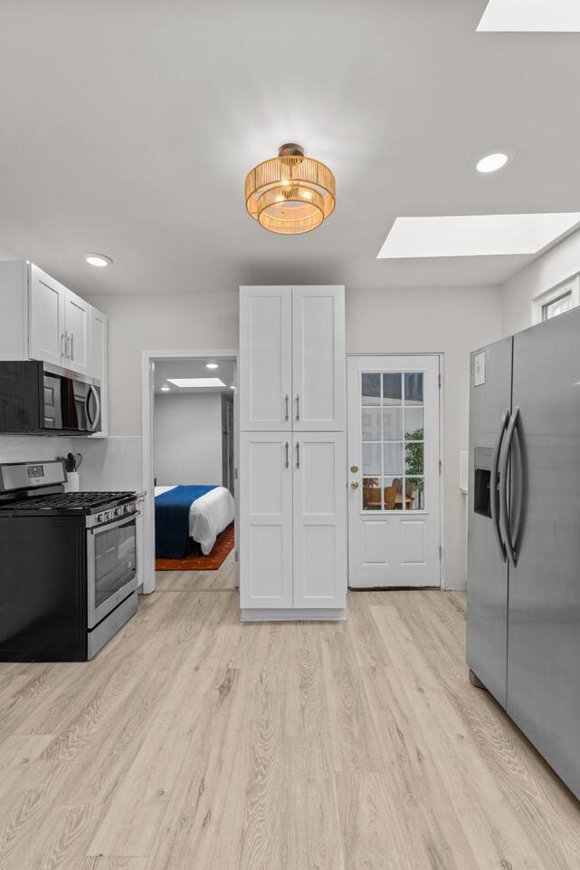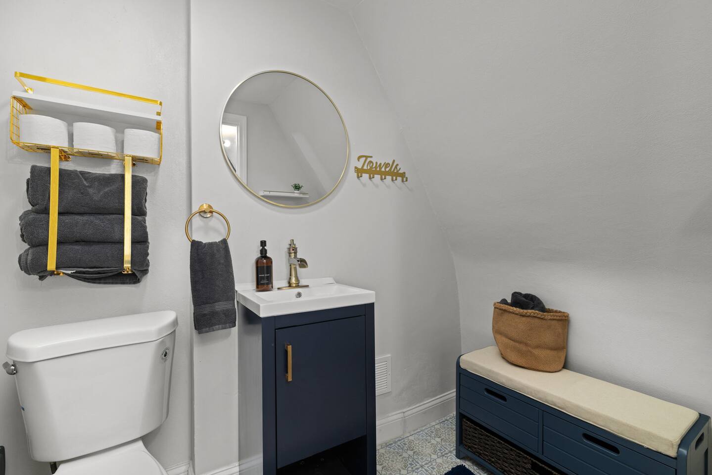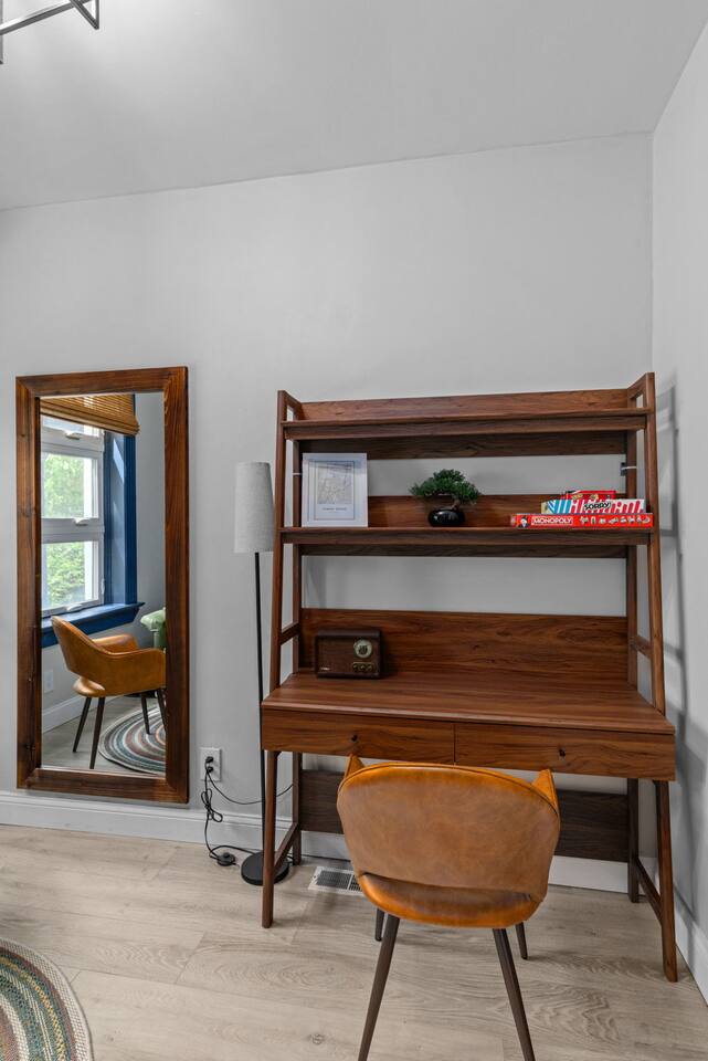 Master Bedroom Skylights in the bedroom and ensuite bathroom fill the space with natural light. We provide sleep masks for our guests. Upstairs Loft + Half Bath Two twin beds and a half bath upstairs—great for kids or extra guests. The staircase is steeper and narrower than in modern homes, which adds charm but may not be ideal for those with mobility issues. Front Office Features a pull-out sofa, dedicated workspace, and family-friendly games on the desk. Kitchen Stocked with cookware, a blender, coffee maker, and cleaning essentials. Trash Dumpsters are just behind the house, outside the back gate. Backyard Covered outdoor seating area with an outdoor trash bin and poop bags. Landscaping is in progress—thanks for your patience as we continue to improve!